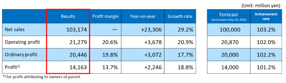 In FY2026/3 interim, the net sales is 58,232 million yen (+58.3% in YoY), the operating profit is 14,130 million yen (+110.8% in YoY), the ordinary profit is 13,614 million yen (+114.4% in YoY), the profit attributing to owners of parent is 8,993 million yen (+103.3% in YoY).