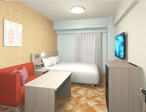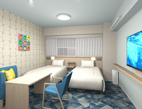 客室は、お一人様からグループまで幅広くご利用いただける広々とした15㎡のダブルルーム(ベッド幅150cm)と、ゆとりのあるツインルーム(ベッド幅110cm、最大4名)を中心に構成しており、当社グループホテルが大切にしている“1cmの快適性と機能性”を追求しています。全客室にサータ社製の快眠ベッドを導入するとともに、横になり足を伸ばしてくつろげるソファや、デスクワークやお食事にも便利な大きなテーブルを備え、あったら嬉しいところにコンセントを配置するなど、客室での時間をより心地よく快適にお過ごしいただける工夫を随所に施しています。