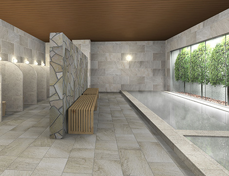 阿蘇の名湯・黒川温泉のやさしい湯あたりを再現した温泉成分入りの人工温泉の大浴場は、屋内にありながらも露天風呂のような開放感が広がります。阿蘇の南郷檜(なんごうひ)の森をイメージした装飾を施し、心地よいぬくもりの中、旅や仕事の疲れをゆっくりと癒していただけます。