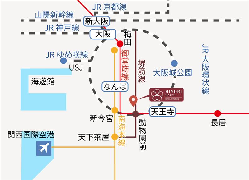 なんばへは御堂筋線で10分、京セラドーム大阪へ15分、ユニバーサル・スタジオ・ジャパンへは約25分と、大阪市内の主要観光エリアへのアクセスに優れています。また、関西国際空港からも約45分と、観光拠点として便利にご利用いただけます。
