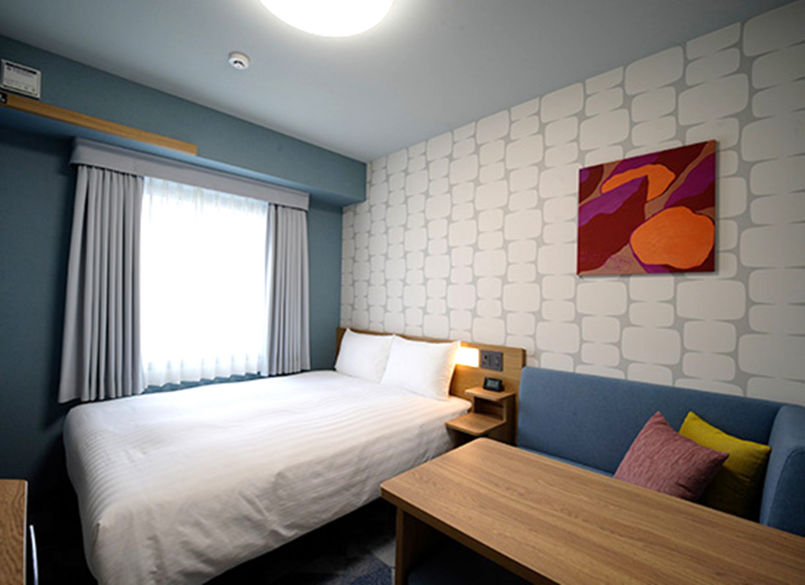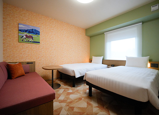 客室タイプは、全体の 7 割以上を占める「ダブルルーム」(15.4 m²/ベッド幅 150cm)を中心に、自炊も可能な IH コンロ付きキッチンを備えた客室もご用意しています。3 名様まで心地よくお過ごしいただける「ツインルーム(20m²)」は、エキストラベッドやソファベッドを備えたタイプ、さらに最大 4 名様までご利用いただける「デラックスツインルーム」(23.2m²)も取り揃え、ビジネスから観光、ファミリーでのご滞在まで、幅広いニーズにお応えいたします。