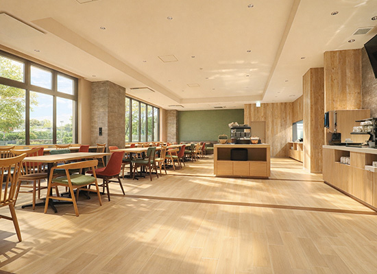 2階にはフロントを備えたロビーラウンジを設け、南阿蘇の檜の森をイメージした落ち着きある空間に仕上げました。お待ち合わせやご滞在中のくつろぎのひとときにご利用いただけます。また、同フロアには会議室(22m²)も併設しており、ビジネス用途にも対応しています。