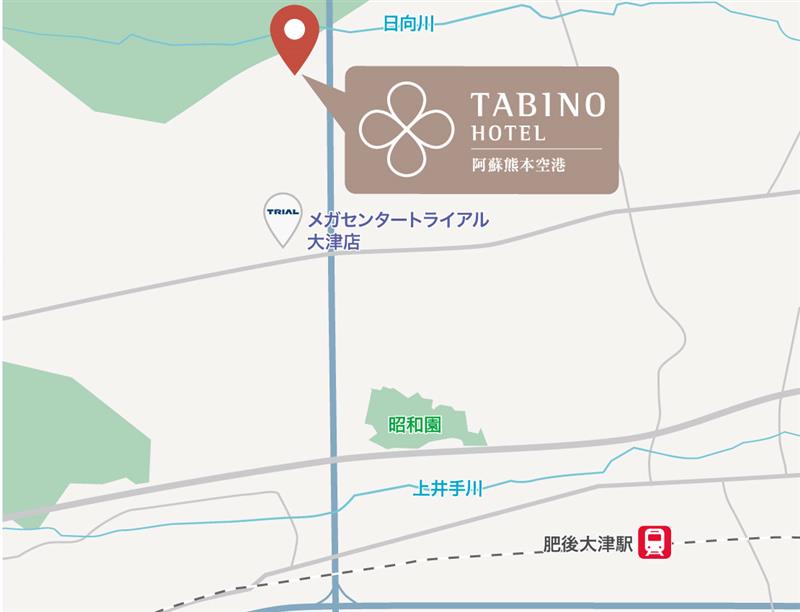 「たびのホテル阿蘇熊本空港」は、熊本空港から車で約 10 分、熊本市中心部から約 30 分、半導体関連企業が集積するセミコンテクノパークへ車で約 5 分と、ビジネス出張の拠点として便利な立地です。また、熊本市や阿蘇エリアを結ぶ主要幹線・国道 325 号線沿いに位置しており、九州縦貫自動車道「熊本インターチェンジ」からも車で約 15 分と、広域移動にも適しています。敷地内には大型車も駐車可能な 150 台の平面駐車場を備えており、お車での移動でも安心してご利用いただけます。