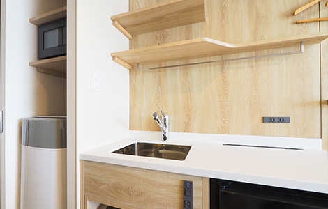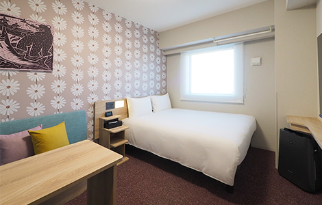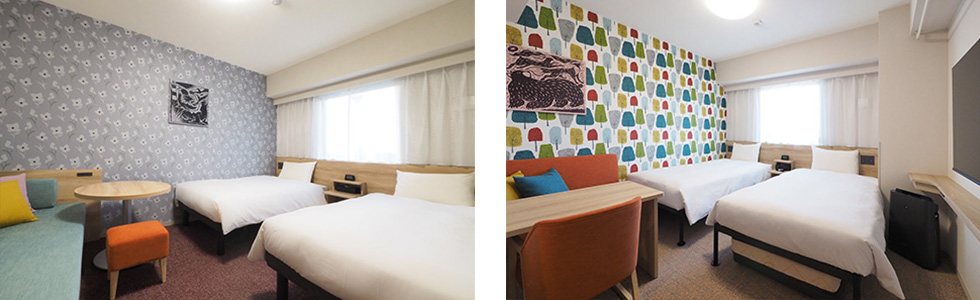 客室の7割以上を占めるダブルルームには、洗濯機・電子レンジ・2ドア冷蔵庫・加湿機能付き空気清浄機・50インチ以上のスマートTVを完備しています。さらに、IHコンロを備えたキッチン付きダブルルーム(15.7㎡~17.2㎡/ベッド幅150cm)もご用意しており、自炊しながらの滞在をサポートします。このほか、最大3名様でご利用いただける「スタンダードツインルーム」(約18.7㎡/ベッド幅110cm)や、「ユニバーサルダブルルーム」(約22.1㎡/ベッド幅110cm2台)もご用意し、ビジネスから観光、ファミリーでのご滞在まで、幅広いニーズにお応えします。