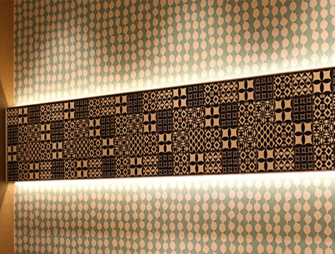 館内は、北海道の大自然をモチーフに、北欧調のモダンで温かみのある雰囲気で統一しています。お客様がホテルに到着されて最初に目にするフロント背面には、アイヌの伝統文様をモチーフにしたアート作品を設置し、石狩の歴史や文化を感じていただける空間を演出しています。
