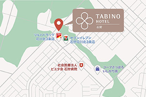 「たびのホテル石狩」は、車で札幌市中心部から約30分、新千歳空港から約1時間と、道内外からのアクセスに優れた場所に立地しています。市役所まで徒歩圏内にあり、ホテル周辺にはコンビニエンスストアやドラッグストア、スーパーマーケット、病院や中央郵便局が揃っており、また、「コストコ石狩倉庫店」へも車で約7分と、長期滞在にも適した環境が整っています。また、当ホテル敷地内には110台収容可能な無料平面駐車場を完備しており、お車でお越しのお客様にも安心してご利用いただけます。