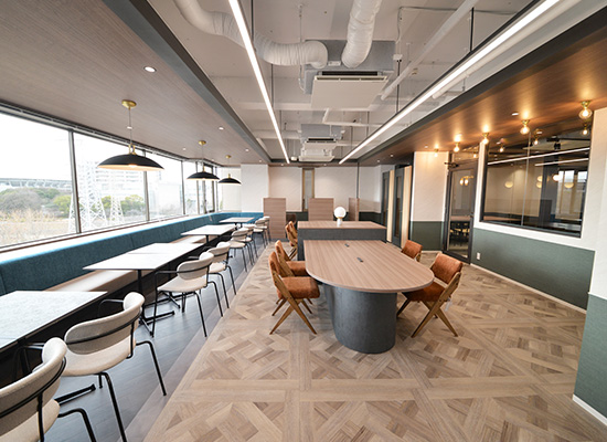 内装には、窓から広がる景色と調和する落ち着いた色合いやテクスチャを用い、インダストリアルな雰囲気にカフェテイストを掛け合わせました。働く人が日常的に心地よく過ごせ、“自分たちの拠点”として育てていける空間を目指しています。一部のオフィス区画では、採光を活かした通り側にラウンジを配置し、会議室や軽い打ち合わせスペースを経て執務エリアへとつながる構成としました。業務内容や気分に応じて自然に場所を切り替えられるよう、区画ごとに異なるラウンジ構成を採用しています。