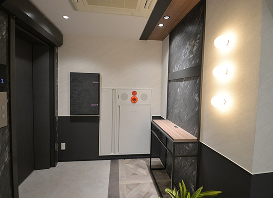 また、執務エリアとラウンジ、会議室の間仕切りにはガラスを用いることで、視線の抜けと採光を確保しました。さらに、各フロアには備蓄倉庫を設け、防災対策と安全性を担保しながら専有スペースを有効に活用できるようにしました。加えて、電気スイッチ類の配置や会議室の独立設計、アース付きコンセントを備えたパントリーなど、細部にまで使いやすさと安心を追求しています。